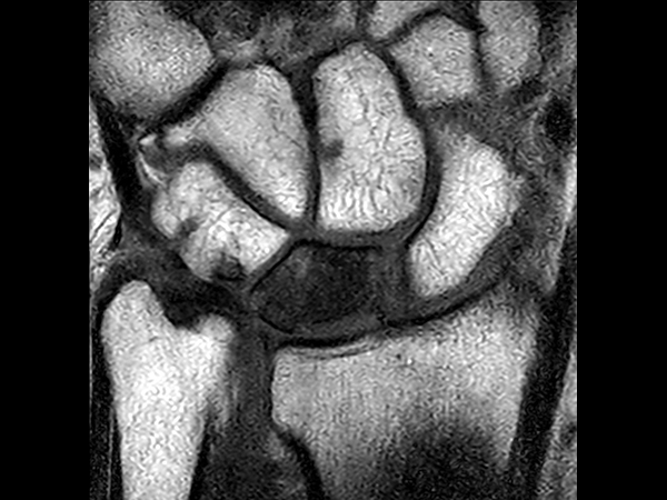 Patient with a lesion in his wrist. dS Microscopy coil set is used, consisting of two 47 mm coils, for small field-of-view imaging with high in-slice spatial resolution and a high signal-to-noise ratio. Compressed SENSE is used in all sequences to shorten the overall exam time for the patient.